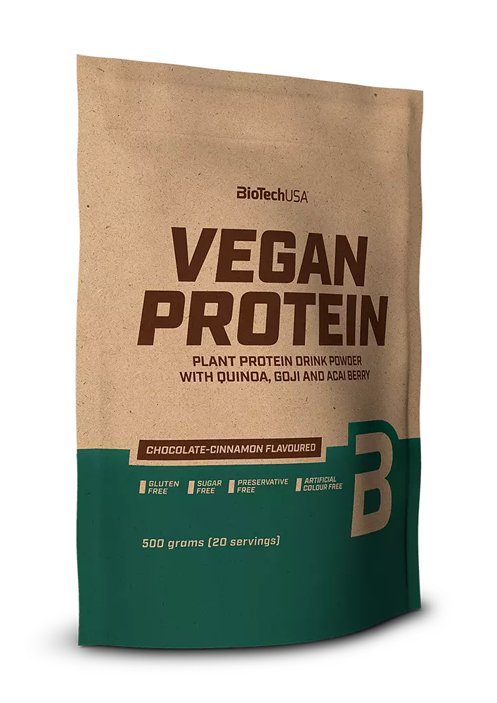 *A por formátumú termékek esetében az állítás a vízzel hígított, fogyasztásra kész termékre vonatkozik. **Gluténmentes az Európai Unió szabályozásának megfelelően. ***Kizárólag a kávé ízű termék esetében. KEVESEBB MŰANYAG – TÖBB GONDOSKODÁS Környezetünk, bolygónk sorsa nekünk is nagyon fontos, ezért a csomagolásánál gondoskodtunk róla, hogy az kevesebb műanyag felhasználásával készüljön! Less Plastic – More Care Csatlakozz hozzánk, válaszd a természetet és óvd a környezetet! A vegán sportoló: igen, létezik! Húsmentes diétán élve is kisportolt testre vágysz? Kellő odafigyeléssel lehetséges! Sokan attól félnek, hogy állati eredetű táplálék nélkül nem megy majd a testépítés, így kárba vész a sok edzés. Rengeteg híres sportoló sikere bizonyítja, hogy nincs igazuk. Vegánként is lehetsz izmos, még akkor is, ha vérbeli ragadozóból lettél egy csapásra növényevő. A kulcs a minőségi fehérjepótlás. A rizs és a borsó az alap A növényi eredetű élelmiszerek, szemben az állati eredetűekkel, nem komplett fehérjeforrások: vagyis, nem tartalmazzák az összes esszenciális aminosavat, amelyekre szervezetünknek szüksége van. Szerencsére azonban az ún. komplettálással (a különböző, növényi eredetű fehérjeforrások kombinálásával) teljes értékű fehérjét nyerhetünk. Ezt tesszük a Vegan Protein előállításakor is két, egymást remekül kiegészítő fehérjeforrás párosításával: a lizinben szegény, de kéntartalmú aminosavakban (pl.: cisztein és metionin) gazdag rizsfehérjéhez kéntartalmú aminosavakból kevesebbet tartalmazó, viszont lizinben bővelkedő borsófehérjét adunk.  Ezt a kiváló alapot pedig még további extrákkal is kiegészítjük. + 3-féle szuperélelmiszer Quinoa liszt → A quinoát, a reformkonyhák sláger-alapanyagát az ősi inkák egyenesen a gabonák anyjaként tisztelték. Acaibogyó-por → Az acai bogyó az amazóniai őserdőkben őshonos egzotikus összetevő. Gojibogyó-por → A farkasbogyóként is ismert, a cseresznye és a szeder ízének keverékére emlékeztető, savanykás, élénkpiros gyümölcsöt Kínában hosszú évezredek óta fogyasztják. Kinek ajánljuk a BioTechUSA Vegan Protein-t?